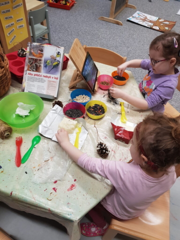 Na naši zimní výpravu jsme se důkladně připravili. Děti s nadšením vyrobily spoustu lojových koulí plných semínek a k tomu jsme přibalili i jablíčka a oříšky. Za slunečného dne jsme se vydali na procházku, abychom pozorovali zvířátka, která jsou v zimě aktivní. V lese a v parcích jsme rozvěsili ptačí dobroty koule a s dětmi jsme pozorovali zimní přírodu. Děti si tak užily nejen zábavu, ale také se naučily, jak můžeme pomáhat zvířátkům v zimních měsících.