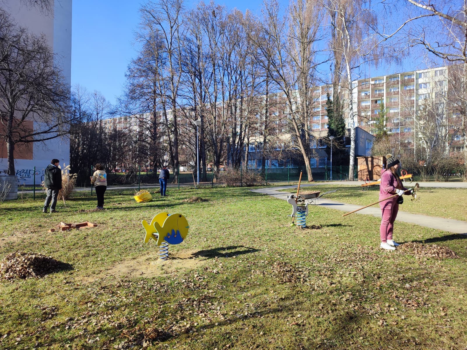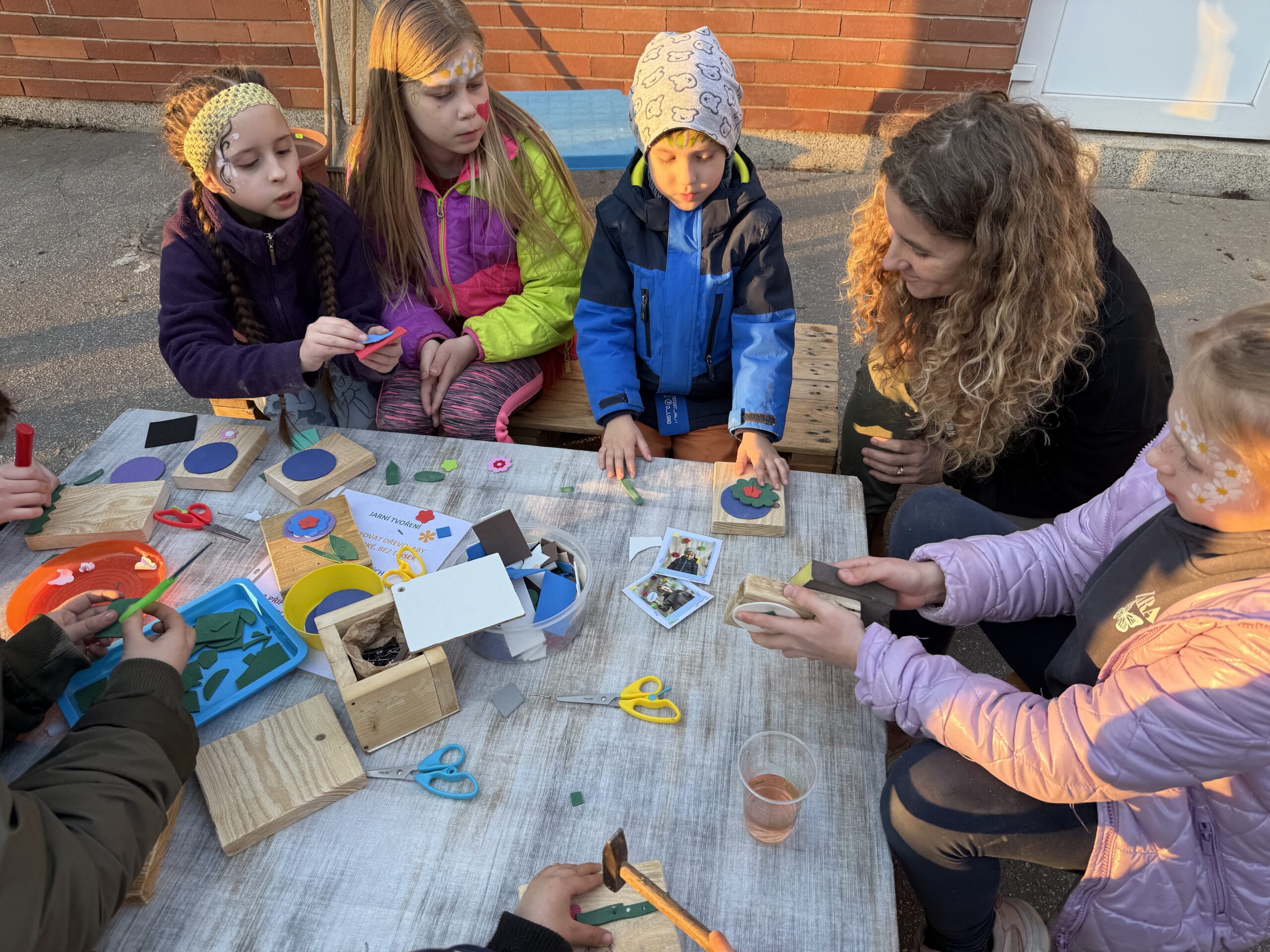 První jarní den odpoledne se školní zahrada proměnila v místo příjemného setkání a společné práce dětí, rodičů a pedagogů naší školy. Sešli jsme se, abychom společně uklidili zahradu po zimě. Hrabali jsme listí, zametali cesty, stříhali keře a prováděli další potřebné úklidové práce. Děti navíc s radostí tvořily jarní dekorace, pracovaly se dřevem, zatloukaly jarní motivy, užívaly si kreslení na obličej a fotily se v připraveném jarním fotokoutku.